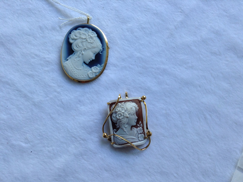cammeo di agata montato in oro, cammeo in conchiglia montato in oro