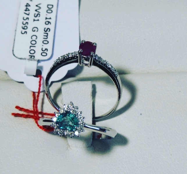 Anelli d'oro bianco con rubino ottagonale, smeraldo a cuore,e diamanti