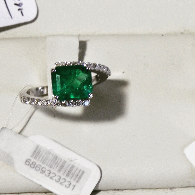 anello d'oro bianco con diamanti e ottagono di smeradlo